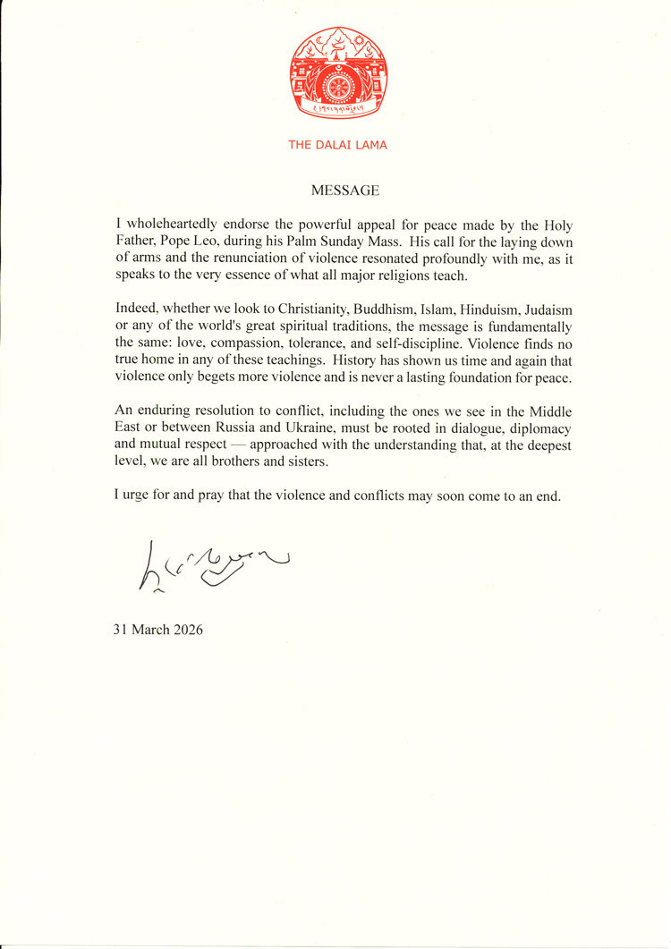 教皇レオ14世が「聖週間」の始まりを告げる「受難の主日(枝の主日)」のミサで述べられた、平和への力強い訴えに私は心からの支持を表明します。武器を捨て、暴力を放棄するようにと求める教皇の呼びかけは、すべての主要な宗教が説いている本質そのものであり、私の心に深く響きました。